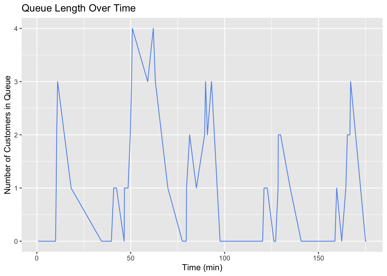geom_stepplots usingggplot,gganimate, andgifski - Compared analytical system metrics to those we obtained from the simulation.
