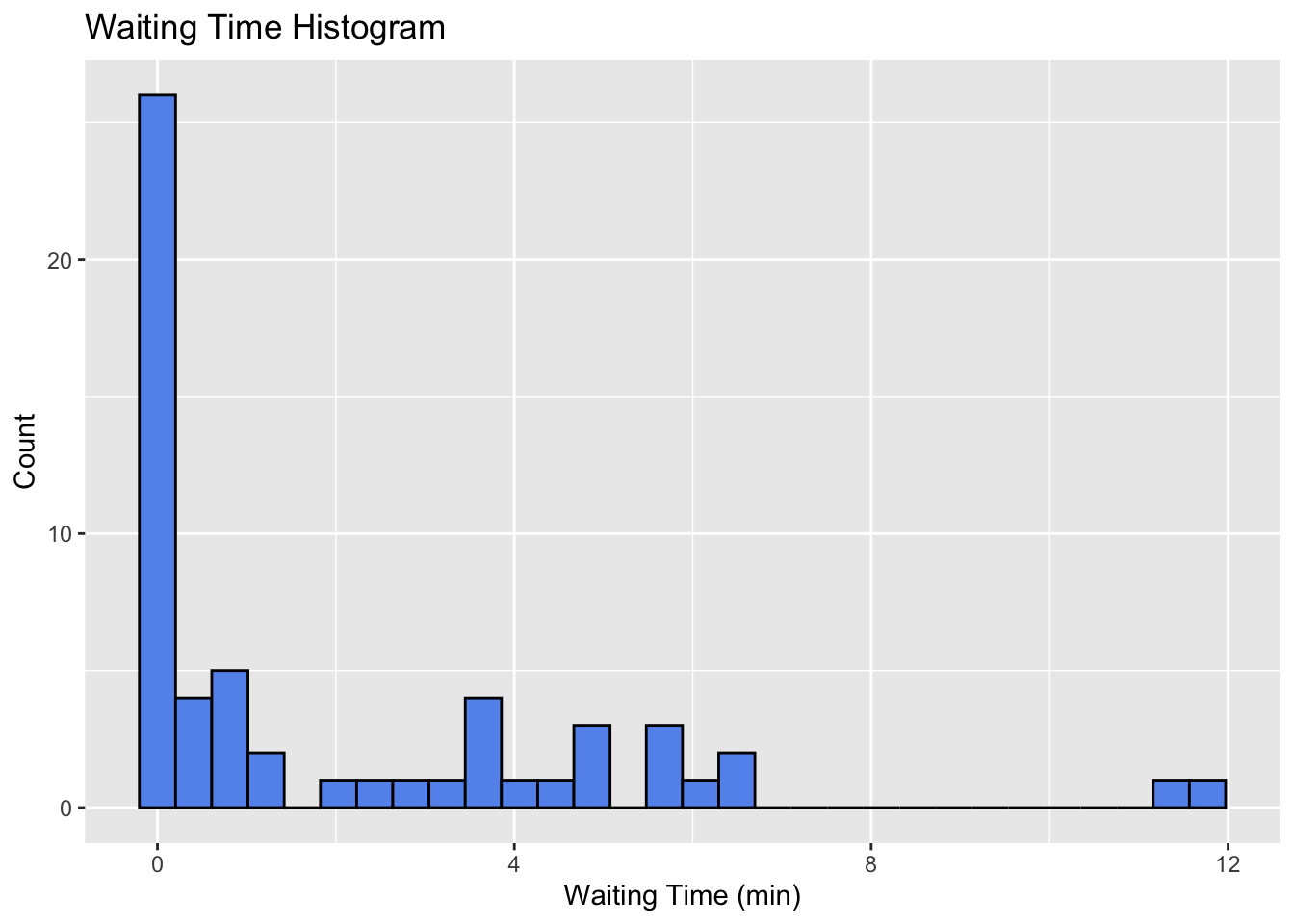 - The first data is customer centric. All we see is how many people are in line when the customer shows up. \(W\) and \(W_q\) are obtainable from this.